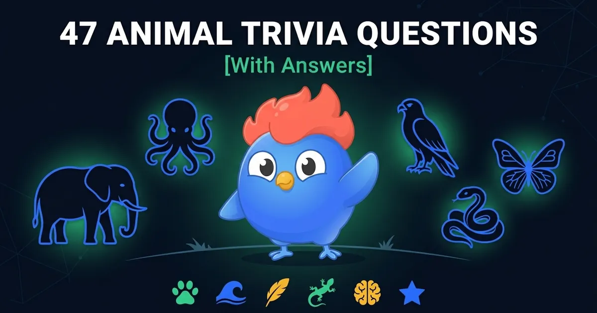 These 47 animal trivia questions on LearnClash cover mammals, ocean creatures, birds, reptiles, insects, and deep-cut zoology facts that stump even biology majors. Every question includes the answer and a breakdown of why it catches people off guard, with facts cross-checked against National Geographic and the Smithsonian National Zoo.